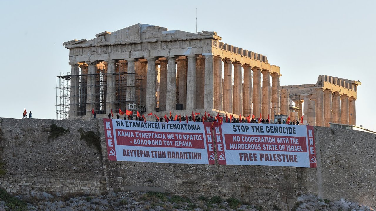 Μέλη του ΚΚΕ και της ΚΝΕ πραγματοποίησαν σήμερα το πρωί συντονισμένη κινητοποίηση στον ιερό βράχο της Ακρόπολης, αναρτώντας δύο μεγάλα πανό υπέρ της Παλαιστίνης. Η κίνηση έγινε από την πλευρά της οδού Διονυσίου Αρεοπαγίτου, προκαλώντας την προσοχή των περαστικών και των τουριστών.