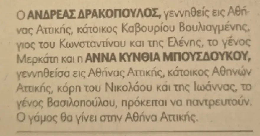 Μια ευχάριστη είδηση έρχεται να επιβεβαιώσει τις φήμες των τελευταίων ημερών: η γνωστή δημοσιογράφος Άννα Μπουσδούκου και ο Ανδρέας Δρακόπουλος, Πρόεδρος του Ιδρύματος Σταύρος Νιάρχος, πρόκειται να ενωθούν με τα ιερά δεσμά του γάμου. Η ανακοίνωση του ευτυχούς γεγονότος έγινε με την παραδοσιακή δημοσίευση της αγγελίας σε εφημερίδα, επιβεβαιώνοντας έτσι επίσημα την απόφαση του ζευγαριού να επισημοποιήσει τη σχέση του.