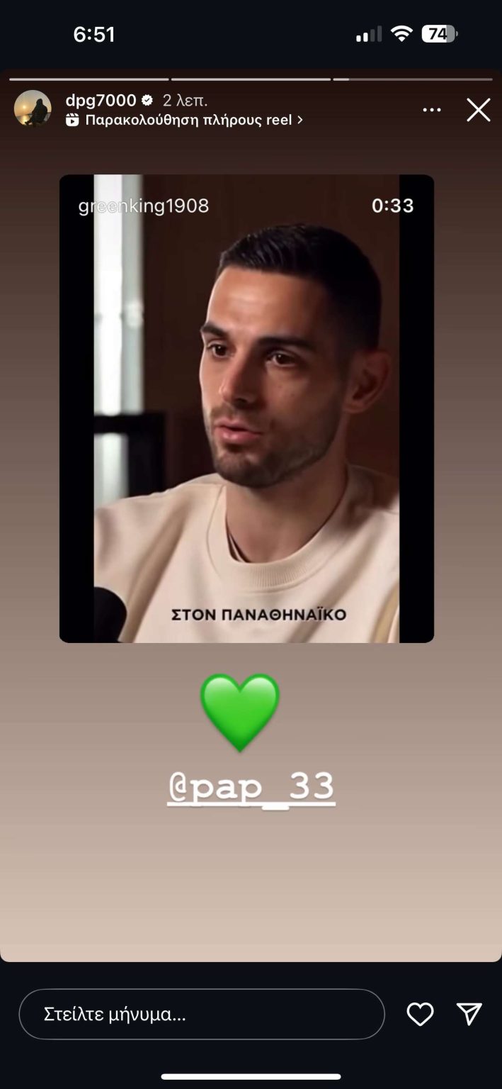 Μέσω ενός story στον προσωπικό του λογαριασμό στο Instagram, ο Γιαννακόπουλος αναδημοσίευσε ένα απόσπασμα από παλαιότερη συνέντευξη του Παπαπέτρου. Στην οποία ο διεθνής φόργουορντ αναφερόταν στον Παναθηναϊκό. Κάτω από το βίντεο, ο ισχυρός άνδρας των «πράσινων» πρόσθεσε μια πράσινη καρδιά και έκανε mention τον πρώην αρχηγό της ομάδας, @pap_33. Στέλνοντας ένα σαφές μήνυμα σεβασμού και εκτίμησης.