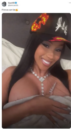 Στο συγκεκριμένο στιγμιότυπο η CardiB χαμογελά στον φακό και φορά μόνο ένα καπέλο κι ένα διαμαντένιο κολιέ.