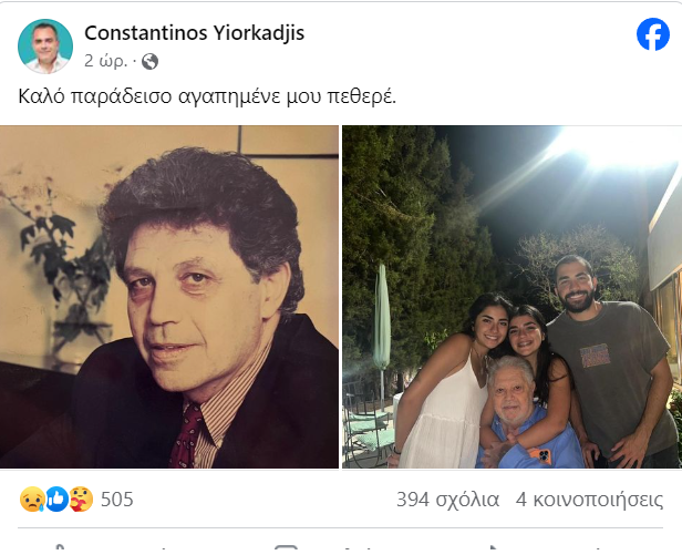 «Καλό παράδεισο αγαπημένε μου πεθερέ» έγραψε στη λεζάντα και συνόδευσε την ανάρτηση με δύο φωτογραφίες του εκλιπόντα, μία από την παρελθόν και μία πρόσφατη με τα εγγόνια του.