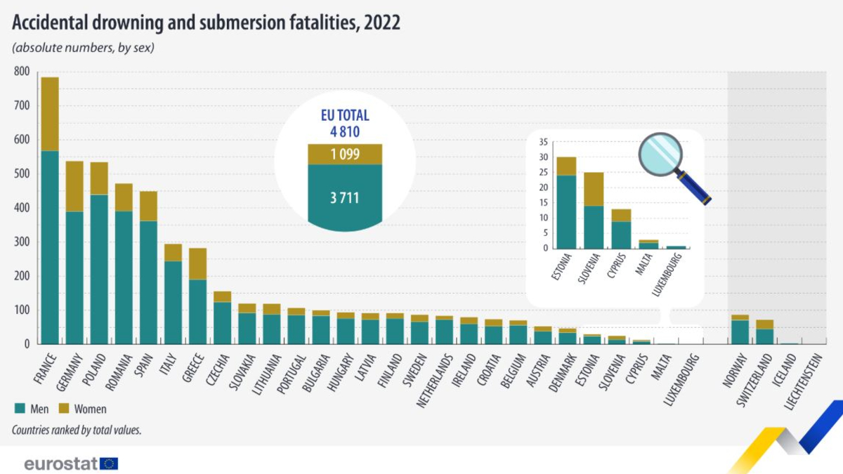 Σύμφωνα με τα στοιχεία του 2022, οι πνιγμοί στην ΕΕ ανήλθαν στους 4.810, αριθμός που αποτελεί ιστορικό χαμηλό από το 2011. Ωστόσο, στην Ελλάδα καταγράφηκαν 283 θάνατοι, αυξημένοι σε σχέση με τους 258 του 2021. Αυτή η επίδοση φέρνει τη χώρα μας πίσω μόνο από Γαλλία, Γερμανία, Πολωνία, Ρουμανία, Ισπανία και Ιταλία.