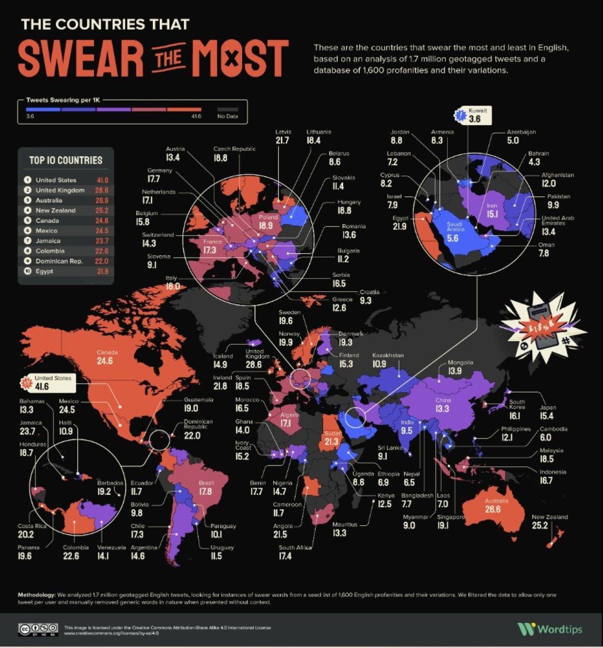 Οι Ηνωμένες Πολιτείες βρίσκονται στην κορυφή της λίστας, με 41,6 βρισιές ανά 1.000 tweets. Ακολουθούν το Ηνωμένο Βασίλειο (28,6), η Αυστραλία (26,6), η Νέα Ζηλανδία (25,2) και ο Καναδάς (24,6).
