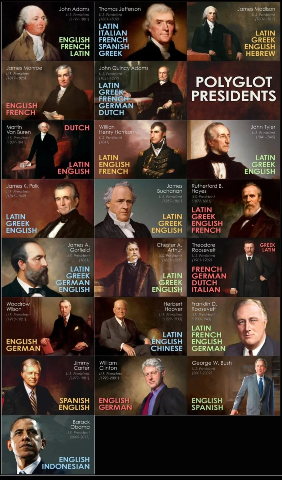 Ποιοί Αμερικανοί Πρόεδροι μιλούσαν Ελληνικά; Σύμφωνα με ιστορικά στοιχεία, εννέα Αμερικανοί πρόεδροι είχαν γνώση της ελληνικής γλώσσας. Αυτή η παράδοση ξεκινά από τον Thomas Jefferson (1801-1809) και συνεχίζεται μέχρι τον Chester A. Arthur (1881-1885), αποδεικνύοντας τη σημασία που αποδίδονταν στην κλασική παιδεία και τη γνώση των αρχαίων γλωσσών.