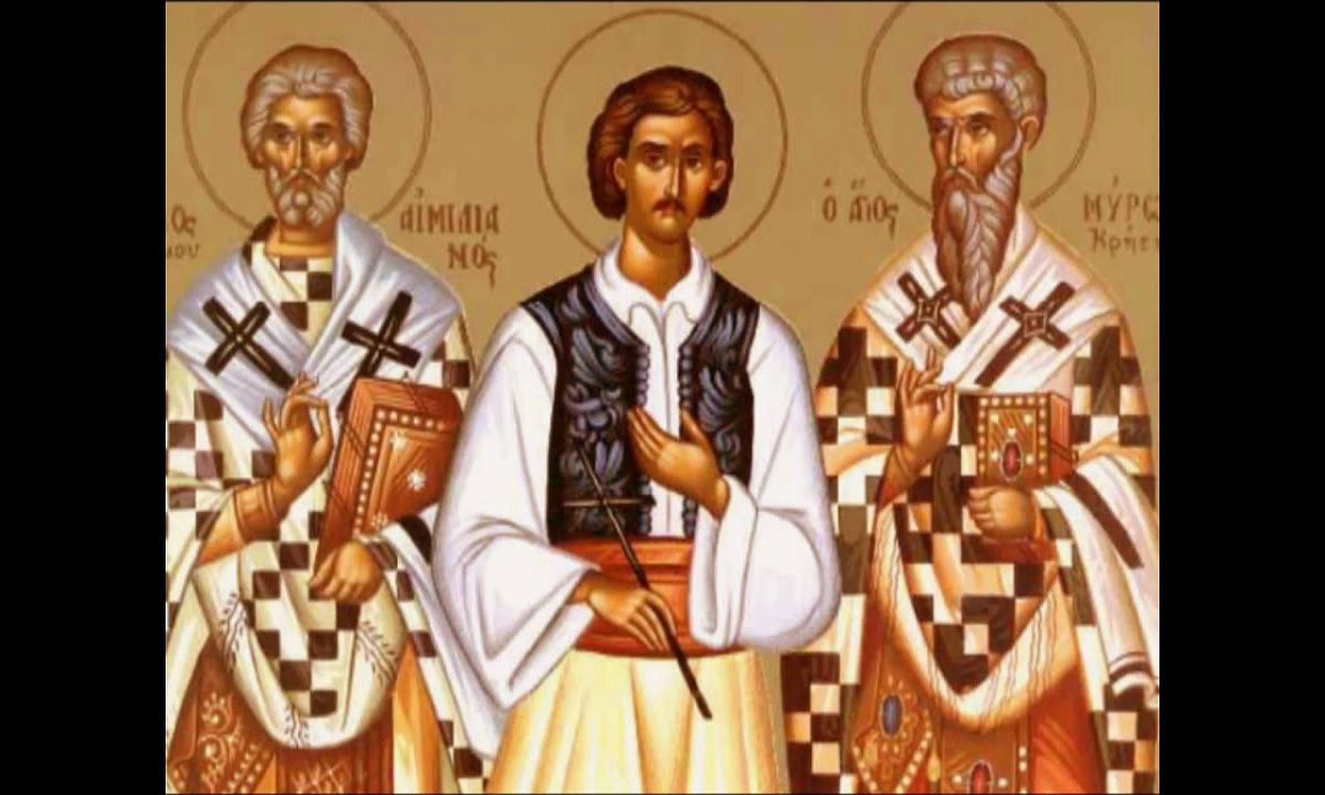 Ο Άγιος Μύρων, καταγόμενος από την πόλη Αυρακία κοντά στην Κνωσσό της Κρήτης, ξεχώρισε από νεαρή ηλικία για τον ζήλο και την ακλόνητη πίστη του στον Θεό. Μετά τον γάμο του, αφιερώθηκε στην καλλιέργεια της γης και από τα προϊόντα που παρήγαγε. Μοίραζε ένα σημαντικό μέρος στους φτωχούς. Όσο περισσότερα έδινε, τόσο αυξανόταν η σοδειά του. Η αφοσίωσή του στους αναξιοπαθούντες ξεπερνούσε κάθε όριο. Λέγεται ότι όταν κάποτε συνέλαβε κάποιους κλέφτες στην αποθήκη του. Όχι μόνο δεν τους κυνήγησε, αλλά τους βοήθησε να μεταφέρουν τα σακιά με το σιτάρι. Για τις αρετές του, ο Μύρων χειροτονήθηκε ιερέας.