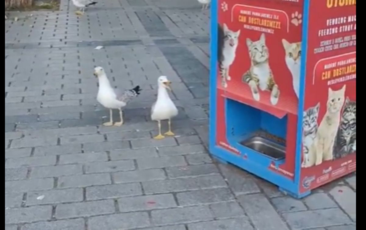 There is a food vending machine for cats in Turkey, the seagulls meow pretending to be cats