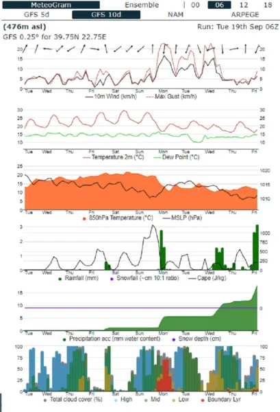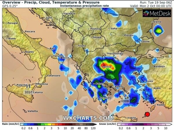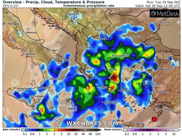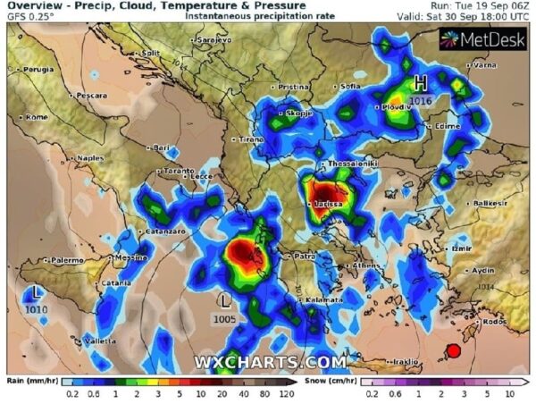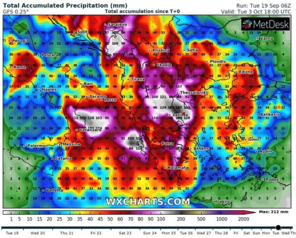 Σύμφωνα με τα μετεωρολογικά δεδομένα της Τρίτης (19/9) του μακροπρόθεσμου Αμερικανικού μοντέλου καιρού GFS… Τα νέα δείχνουν δυσάρεστα για τη Θεσσαλία. Η πρόγνωση θέλει ως από 187 mm υετού (βροχής) αναμένεται να δεχτεί η περιοχή της Θεσσαλίας… Κυρίως στα τέλη του Σεπτεμβρίου με αρχές Οκτωβρίου.