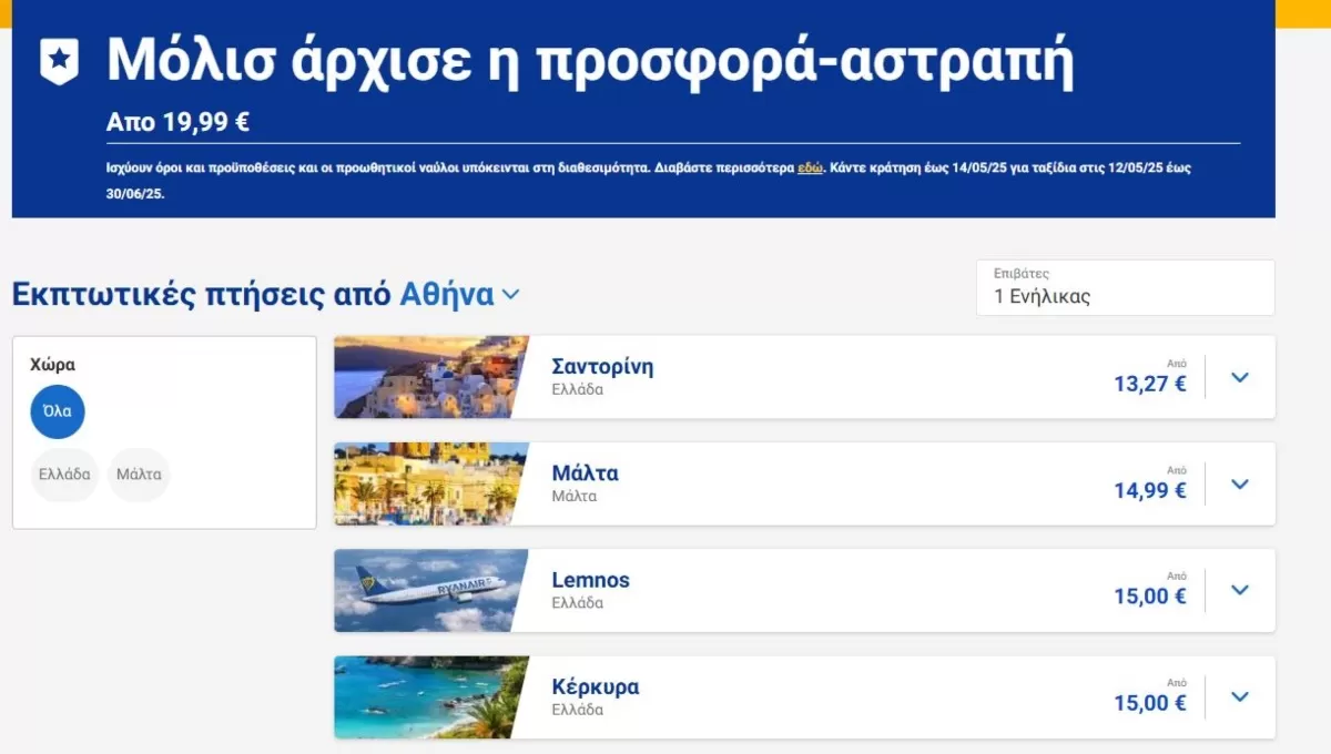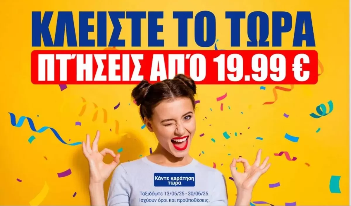Η πιο πρόσφατη ευκαιρία αφορά αεροπορικά εισιτήρια από μόλις €19,99 για συγκεκριμένους ευρωπαϊκούς προορισμούς και είναι διαθέσιμη για περιορισμένο χρονικό διάστημα.