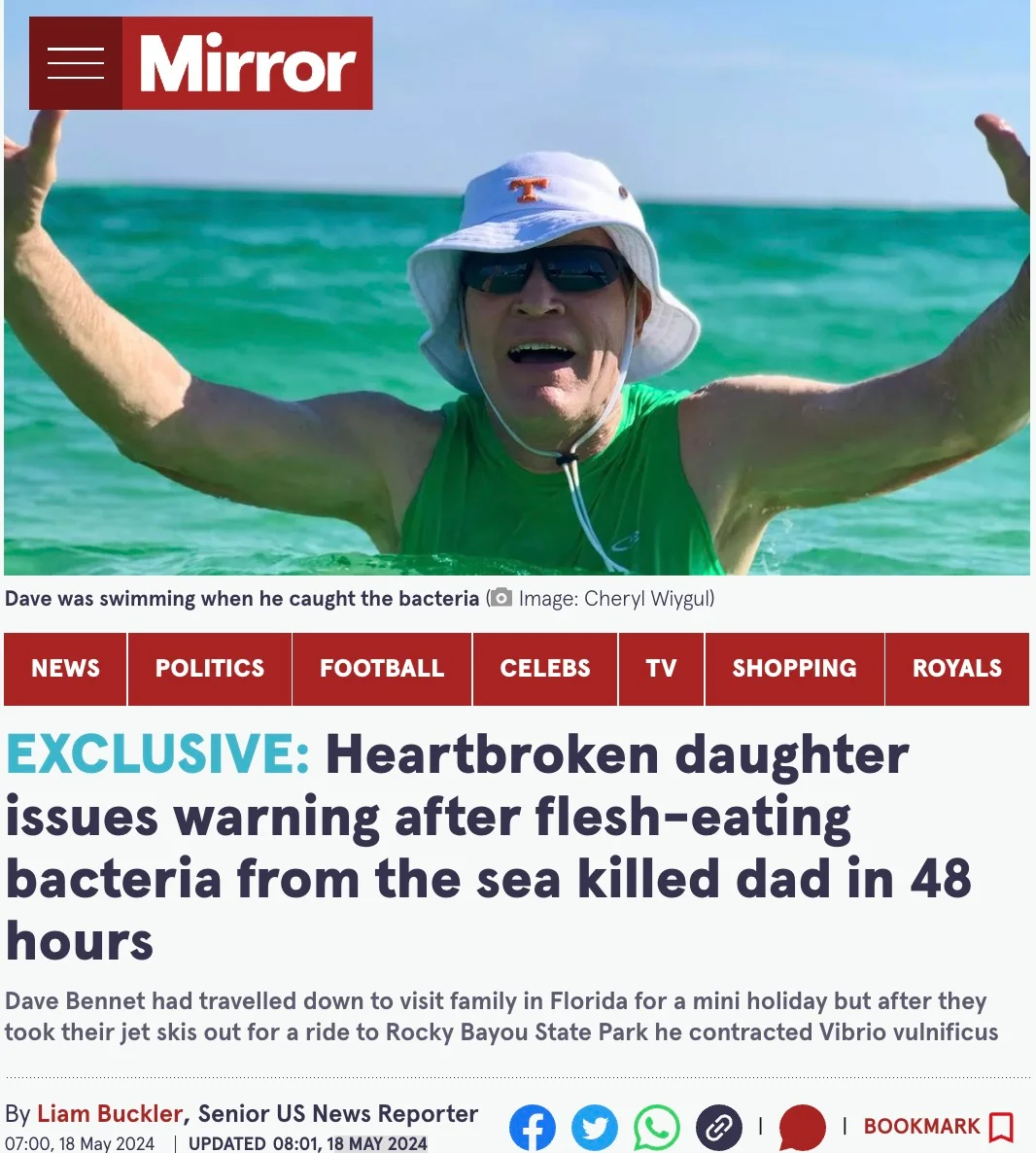 Η μόλυνση από ένα τέτοιο βακτήριο μπορεί να προκληθεί είτε από κατανάλωση ωμών ή μισομαγειρεμένων στρειδιών ή άλλων θαλασσινών, αλλά στην περίπτωση του αδικοχαμένου Ντέιβ προήλθε αφότου κολύμπησε σε υφάλμυρο νερό, που είναι ένα μείγμα αλμυρού και γλυκού νερού, που βρίσκεται κυρίως στις εκβολές ποταμών στη θάλασσα.