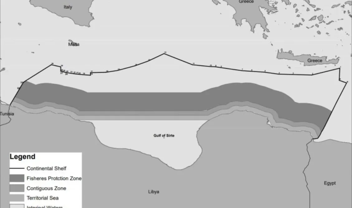 Έχοντας εκ φύσεως (ipso facto) και εξ αρχής (ab initio) κυριαρχικά δικαιώματα επί της υφαλοκρηπίδας της στη Μεσόγειο Θάλασσα, η Λιβύη πιστεύει ότι τα θαλάσσια σύνορα μεταξύ δύο κυρίαρχων κρατών πρέπει να οριστικοποιούνται μέσω διαλόγου και διαπραγματεύσεων, σύμφωνα με το διεθνές δίκαιο και την αρχή της ισότητας.