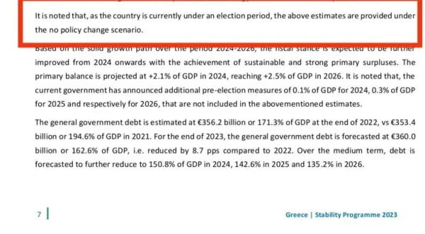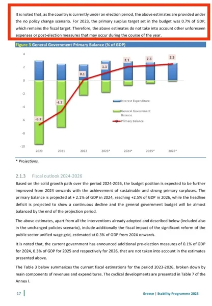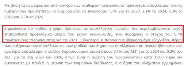 Όπως αναφέρεται χαρακτηριστικά στο επίσημο κείμενο… «Σημειώνεται ότι καθώς η χώρα βρίσκεται σε προεκλογική περίοδο, δεν περιλαμβάνονται τυχόν επιπρόσθετα προεκλογικά μέτρα που έχουν ανακοινωθεί. Ενώ, παραμένει ο στόχος του 0,7% πρωτογενούς πλεονάσματος για το 2023.».