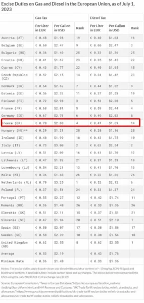 Σε ότι αφορά την Ελλάδα, φιγουράρει στη μέση της κατάταξης των 28 χωρών που παρουσιάζει η ιστοσελίδα, με φόρο 0,41 ευρώ ανά λίτρο για το ντίζελ, που τη φέρνει στη 14η θέση.