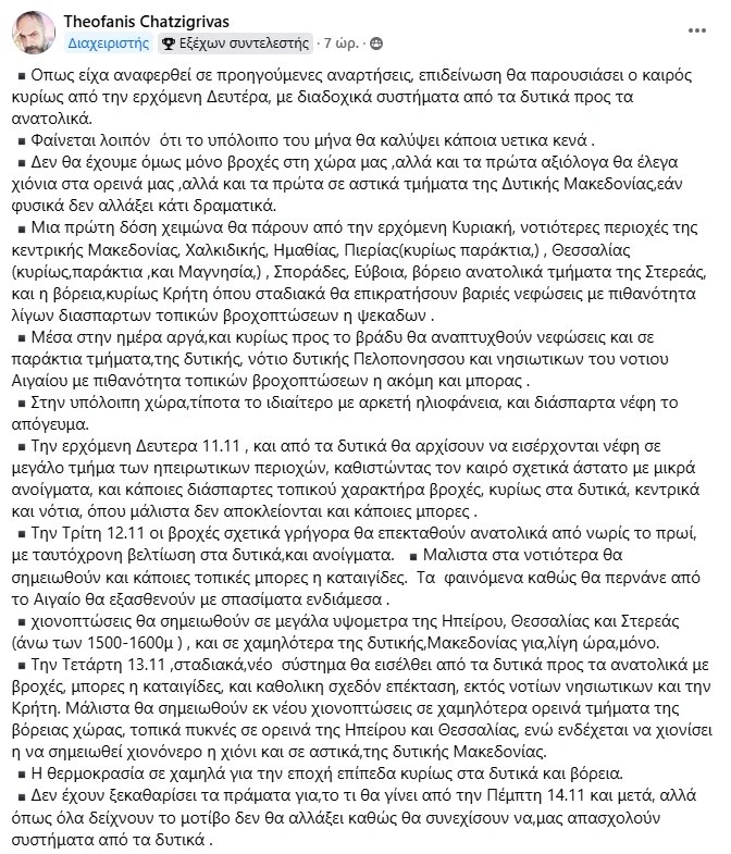 Όπως αναφέρει σε ανάρτησή του, η κακοκαιρία θα ξεκινήσει από την ερχόμενη Κυριακή, 8 Νοεμβρίου. Επηρεάζοντας κυρίως τις περιοχές της κεντρικής Μακεδονίας, Χαλκιδικής, Ημαθίας και Πιερίας. Με βροχές και χιονοπτώσεις σε ορεινές περιοχές. Παράλληλα, προβλέπονται τοπικές βροχοπτώσεις και μπόρες στις δυτικές και νότιες περιοχές της Πελοποννήσου και στα νησιά του νοτίου Αιγαίου. Με περαιτέρω επιδείξεις του καιρού από τη Δευτέρα 11 Νοεμβρίου και μετά.