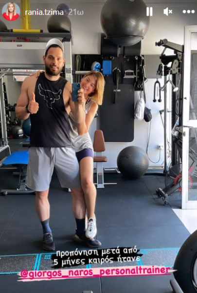 Όπως φαίνεται όμως, εκτιμά πολύ τον γυμναστή που εμπιστεύεται και θέλησε να μοιραστεί με τους διαδικτυακούς της ακολούθους ποιος είναι. Έτσι, την βλέπουμε να ποζάρει εντός γυμναστηρίου, χαμογελαστή πίσω από τον personal trainer της, Γιώργο Νάρο. “Προπόνηση μετά από πέντε μήνες, καιρός ήταν” σημείωσε χαρακτηριστικά η παρουσιάστρια ειδήσεων του Μεγάλου Καναλιού.