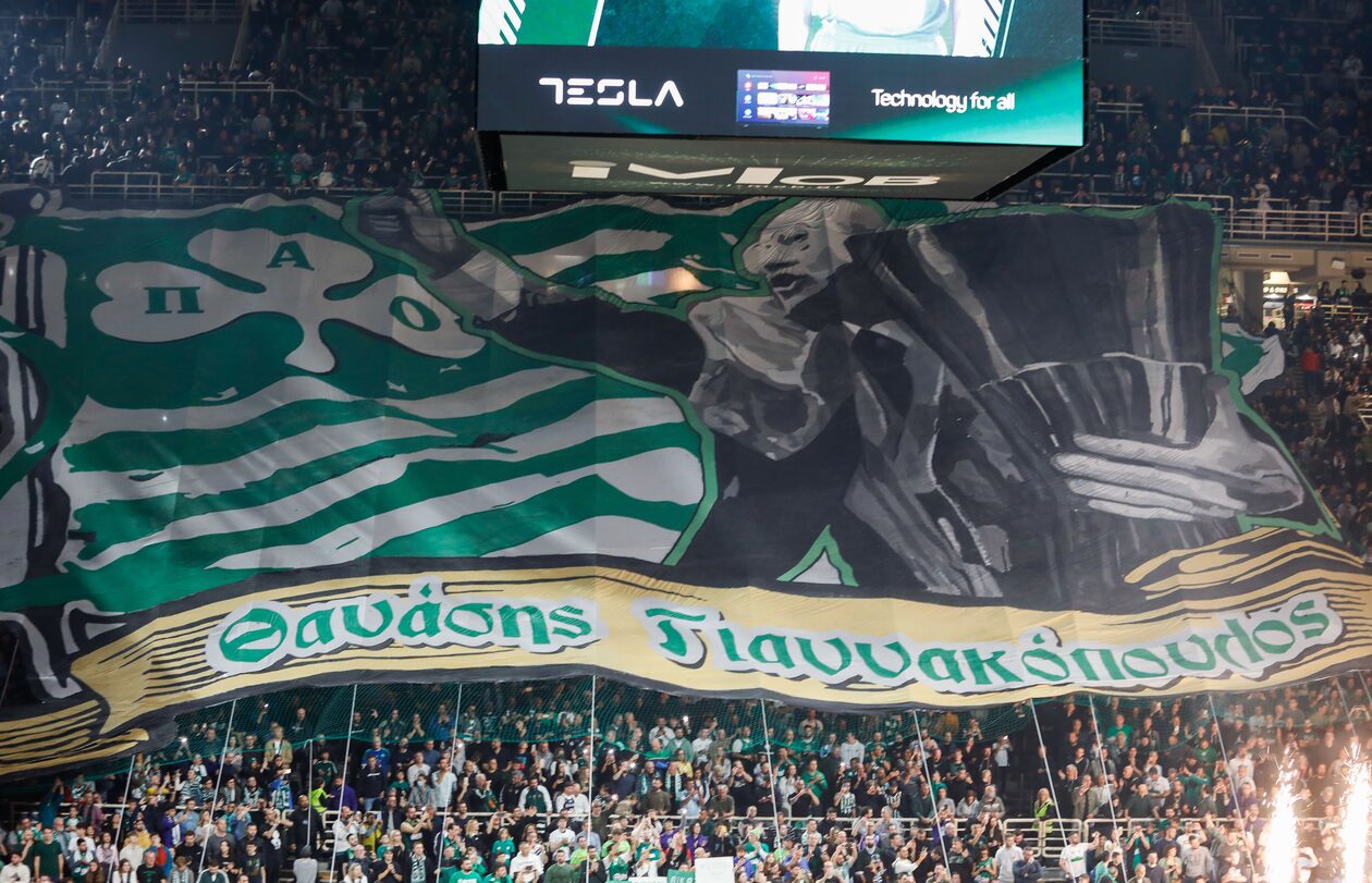 Οι φίλοι του «τριφυλλιού» που γέμισαν το ΟΑΚΑ, ύψωσαν ένα γιγαντιαίο μάλιστα πανό στην κεντρική εξέδρα, το οποίο απεικόνιζε τον… Θανάση Γιαννακόπουλο με το τρόπαιο της Ευρωλίγκας στα χέρια και επίσης τη σημαία του Παναθηναϊκού.