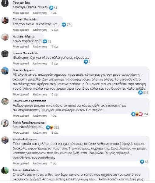 Θρηνώ και οδύρομαι, όταν εννοήσω τον θάνατον του Γιώργου Γεωργίου ως άνθρωπο, αλλά ως τηλεπερσόνα, ως ραδιοφωνικό παραγωγό, ως… αθλητικολόγο, θα έλεγα ότι λυπάμαι που τον είδα, που τον άκουσα, που μου μετέφεραν απόψεις του. (…) Ως άνθρωπο και ως πονεμένο οικογενειάρχη σε τιμώ και ασπάζομαι τα πάθη σου, ως επαγγελματία, όμως… Γιώργο μου, καλό σου ταξίδι και εμείς να ζήσουμε να σε ξεχάσουμε».