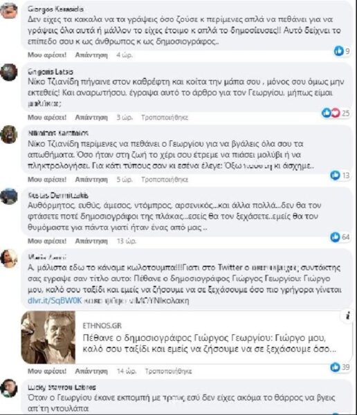 Οι χρήστες των social media, οι ακροατές, αλλά και οι αναγνώστες δεν άφησαν αναπάντητες τις προσβολές του αρθρογράφου, ο οποίος θεώρησε πρέπον να εκφράσει την γνώμη (;) του για τον Γιώργο Γεωργίου την ημέρα του θανάτου του.