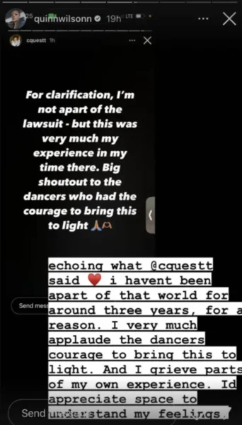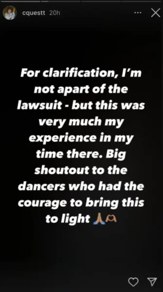 «Αναφορικά με όσα είπε η Κόρτνεϊ… Δεν είμαι μέρος αυτού του κόσμου για περίπου τρία χρόνια κι υπάρχει κάποιος λόγος για αυτό. Θαυμάζω το θάρρος αυτών των χορευτριών να το φέρουν στο φως. Και θρηνώ για τη δική μου εμπειρία. Θα εκτιμήσω να μου δώσετε τον χώρο μου για να κατανοήσω τα συναισθήματά μου», έγραψε στο story της.