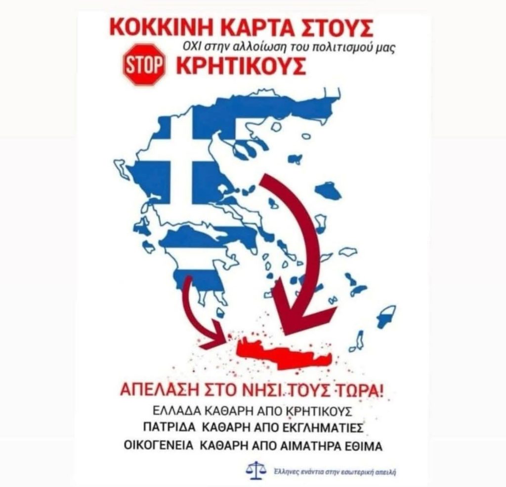 Μια ιδιαίτερα προκλητική και ρατσιστική αφίσα έχει προκαλέσει σφοδρές αντιδράσεις και αγανάκτηση στο ελληνικό διαδίκτυο τις τελευταίες ώρες. Το υλικό, το οποίο απευθύνεται ευθέως στους κατοίκους της Κρήτης, περιέχει ακραίο και προσβλητικό περιεχόμενο, το οποίο πολλοί χρήστες των μέσων κοινωνικής δικτύωσης χαρακτηρίζουν ως απαράδεκτο και διχαστικό.