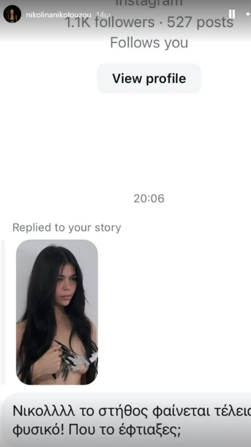 Πρόσφατα, η φετινή νικήτρια του My Style Rocks πραγματοποίησε μια αποκαλυπτική φωτογράφιση, την οποία μοιράστηκε με τους διαδικτυακούς της φίλους στο Instagram. Σε δύο stories που δημοσίευσε, η Νικολίνα ποζάρει topless, καλύπτοντας τα επίμαχα σημεία με μια μεταλλική λεπτομέρεια, προφανώς για τις ανάγκες ενός νέου project.
