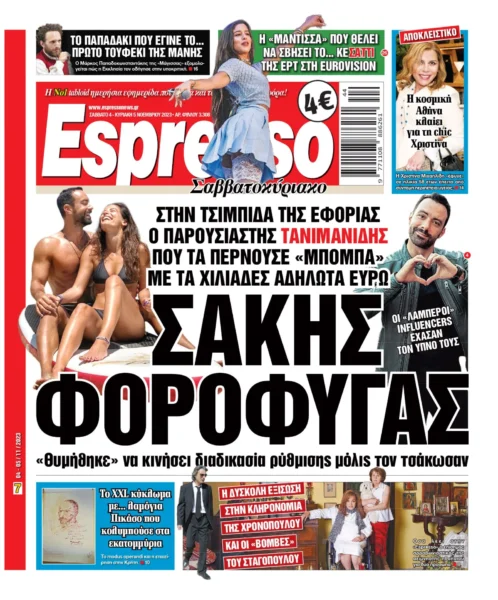 Η εφημερίδα «Espresso» πηγαίνει ένα βήμα παραπέρα και στο πρωτοσέλιδο του Σαββάτου (04/11) κατονομάζει τον Σάκη Τανιμανίδη ως τον influencer που πιάστηκε να φοροδιαφεύγει.