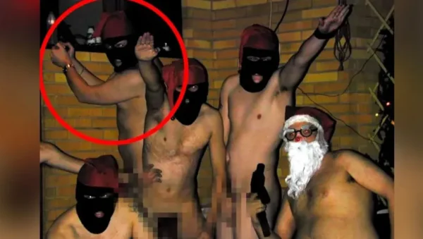 Στην πρώτη ο νέος ηγέτης των Φιλανδών Σοσιαλιστών ποζάρει δίπλα σε άλλους τέσσερις άνδρες. Όλοι τους φοράνε σκούφους του Άγιου Βασίλη και κουκούλες full face με δύο εξ αυτών να κρατάνε όπλα και άλλους δύο να κάνουν τον ναζιστικό χαιρετισμό.