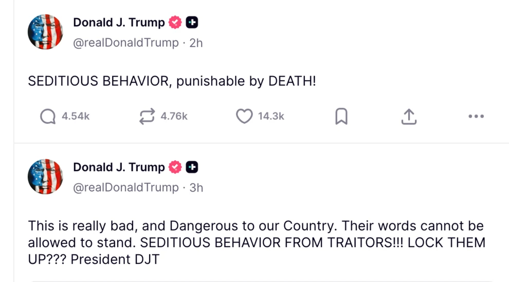 Παρότι δεν διευκρινίστηκε ποιες εντολές κρίνονται παράνομες, η παρέμβαση αυτή προκάλεσε έντονη αναστάτωση στον πολιτικό χώρο των Ρεπουμπλικανών. Ο Ντόναλντ Τραμπ απάντησε με αναρτήσεις στην πλατφόρμα Truth Social, κατηγορώντας τους Δημοκρατικούς για «στασιαστική συμπεριφορά» και ζητώντας να υπάρξει τιμωρία: «Αυτό που λένε είναι επικίνδυνο. Δεν πρέπει να μείνει ατιμώρητο. ΣΤΑΣΙΑΣΤΕΣ!», έγραψε. Λίγη ώρα αργότερα επανήλθε υποστηρίζοντας ότι η «στασιαστική συμπεριφορά τιμωρείται με θάνατο», προκαλώντας νέες αντιδράσεις.