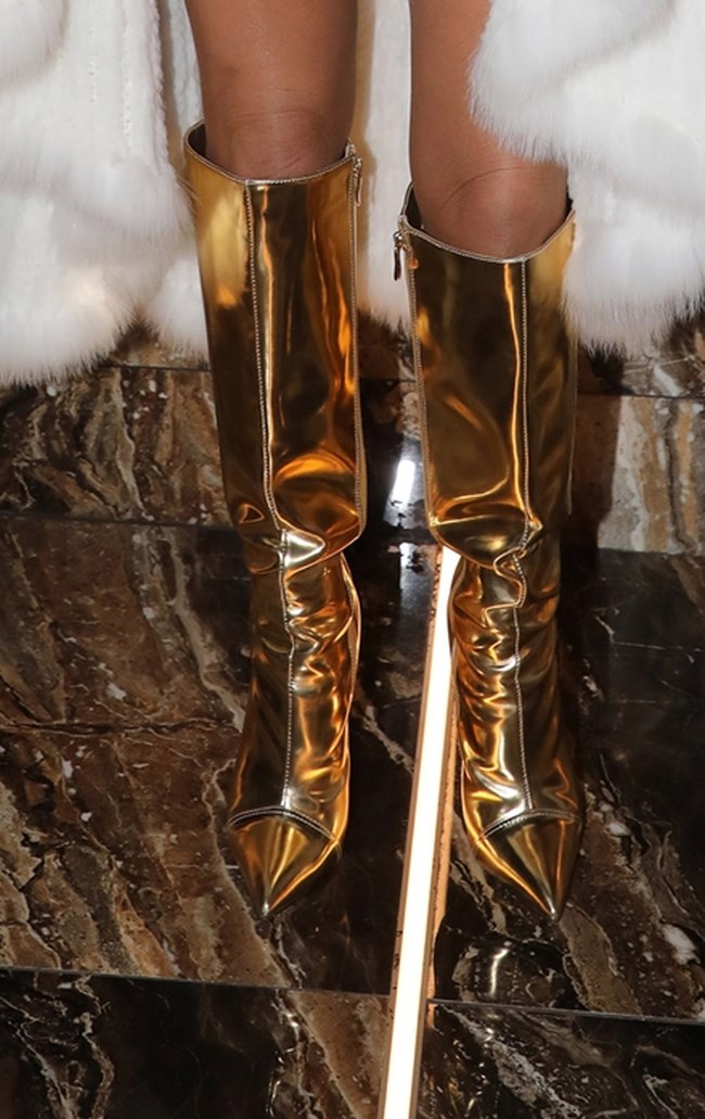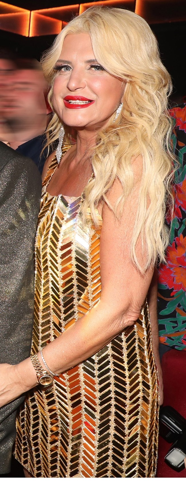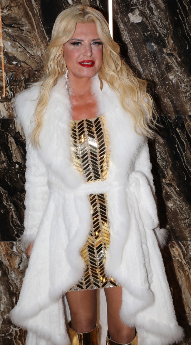 Ειδικότερα, η πρώην σύζυγος του πρώην Περιφερειάρχη Αττικής, Γιώργου Πατούλη, επέλεξε να φορέσει ένα ολόχρυσο φόρεμα… Με ολόχρυσες μπότες, ασύμμετρη λευκή βραδινή γούνα, ένα ζευγάρι τεράστια σκουλαρίκια και έντονο μακιγιάζ συμπλήρωσαν την εμφάνιση.