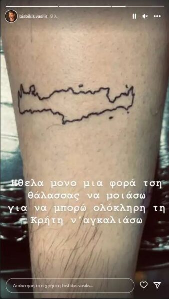 Ο ίδιος έκανε τατουάζ τον χάρτη της Κρήτης και το αποκάλυψε με μια μαντινάδα… «Ήθελα μόνο μια φορά τση θάλασσα να μοιάσω για να μπορώ ολόκληρη την Κρήτη ν’ αγκαλιάσω».