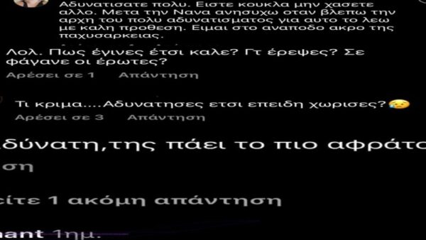 Τα άσχημα σχόλια ποικίλαν με τα πιο κλασσικά όπως… “Πολύ αδύνατη κορίτσι μ πάρε λίγα κιλά ..❤️” μέχρι και σχόλια για το αν φταίει ένας χωρισμός για το σώμα της και τα κιλά της.
