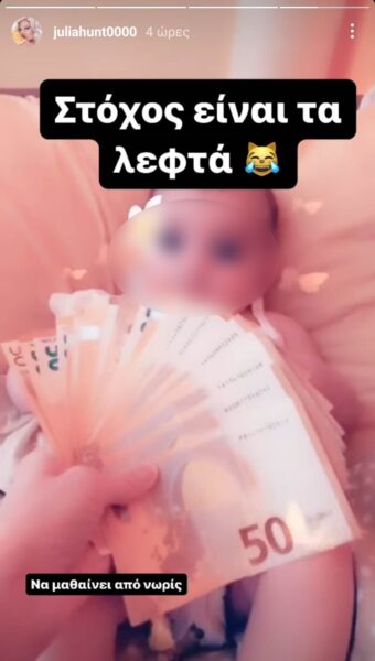 Μάλιστα, σε ένα από τα στιγμιότυπα που ανέβασε πρόσφατα, η πρώην αναπληρωματική Σταρ Ελλάς δείχνει στην 4 μηνών κόρη της, Paris… χαρτονομίσματα των 50 ευρώ για να «μαθαίνει από νωρίς».