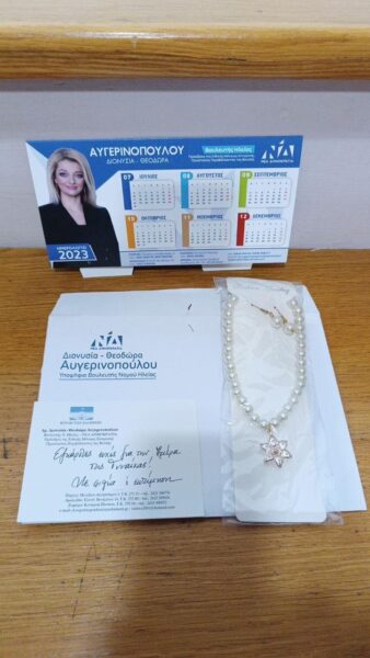 Μέσα στο φάκελο, όπως βλέπετε και στις φωτογραφίες ήταν σκουλαρίκια και περιδέραιο. Δώρο σε όλες τις γυναίκες που υπηρετούσαν σε όλα τα μουσεία του νομού Ηλείας. Σημειώνεται ότι η Δ, Αυγερινοπούλου είναι βουλευτής Ηλείας, αλλά ο φάκελος που έστειλε είναι προεκλογικός. Καθώς υπογράφει ως υποψήφια βουλευτής καθιστώντας εμφανείς τους σκοπούς της κίνησής της. Η πρωτοβουλία της Δ. Αυγερινοπούλου προκάλεσε την οργή των υπαλλήλων οι οποίες (όπως φαίνεται και από τα φωτογραφικά ντοκουμέντα) επέστρεψαν το δώρο που τους έκανε!