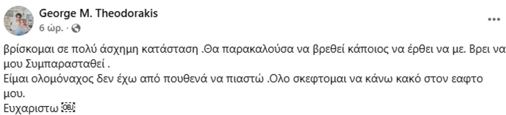 Η δραματική ανάρτηση και η έκκληση του Γιώργου Θεοδωράκη για συμπαράσταση