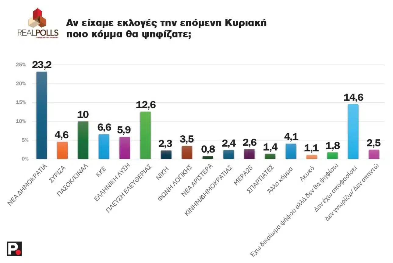 Νέα Δημοκρατία (ΝΔ): Παραμένει πρώτη με 23,2% στην πρόθεση ψήφου, σημειώνοντας άνοδο από την προηγούμενη μέτρηση.