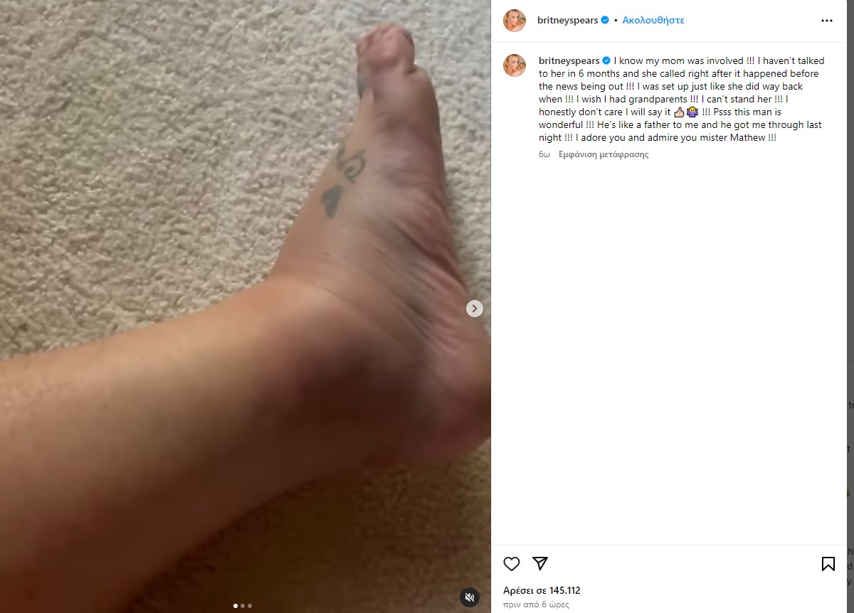 Στη συνέχεια ανέβασε ένα βίντεο δείχνοντας το πρησμένο πόδι της και είπε ότι στραμπούληξε το πόδι της κατηγορώντας τη μητέρα της ότι εκείνη φταίει και το είχε στημένο. «Ξέρω ότι η μαμά μου είναι αναμεμειγμένη!!! Έχω να της μιλήσω 6 μήνες και μου τηλεφώνησε αμέσως μετά το συμβάν πριν γίνει γνωστή η είδηση. Μου την έστησαν όπως ακριβώς και σε εκείνη τότε. Μακάρι να είχα παππούδες και γιαγιάδες. Δεν την αντέχω. Ειλικρινά δεν με νοιάζει, θα το πω».