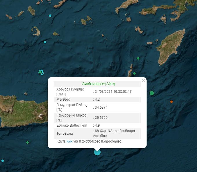 Σύμφωνα με το Γεωδυναμικό Ινστιτούτο, η δόνηση σημειώθηκε 68 χιλιόμετρα νοτιοανατολικά του Λασιθίου. Ενώ το εστιακό βάθος εντοπίζεται στα 4,9 χιλιόμετρα.