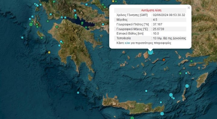 Σύμφωνα με τα πρώτα στοιχεία του Γεωδυναμικού Ινστιτούτου, ο σεισμός ήταν 4,5 Ρίχτερ και σημειώθηκε 13 χιλιόμετρα βορειοδυτικά της Δονούσας.