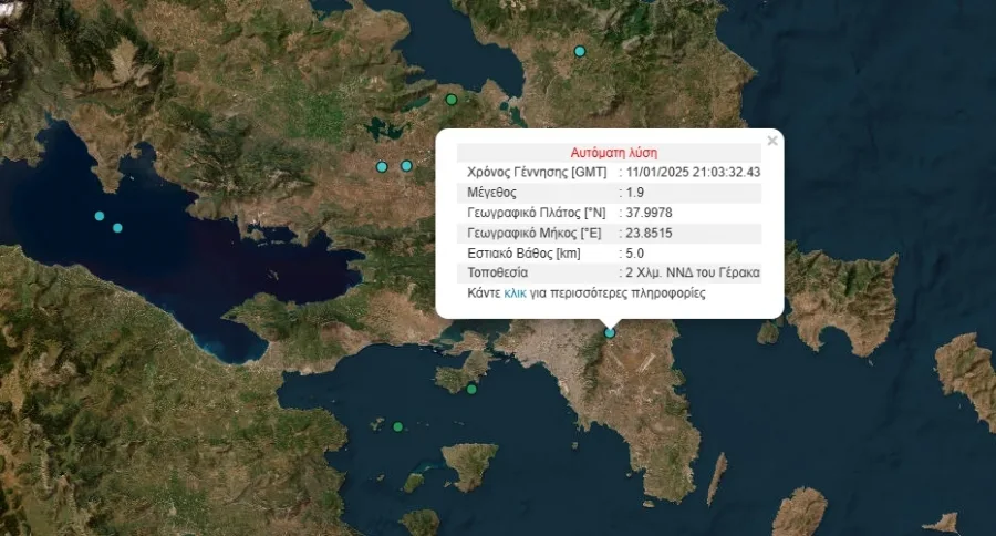 Μια ασθενής σεισμική δόνηση έγινε αισθητή στην Αττική το βράδυ του Σαββάτου, 11 Ιανουαρίου, προκαλώντας ανησυχία στους κατοίκους της περιοχής. Σύμφωνα με τις πρώτες πληροφορίες από το Γεωδυναμικό Ινστιτούτο, ο σεισμός είχε μέγεθος 1,9 βαθμών της κλίμακας Ρίχτερ.