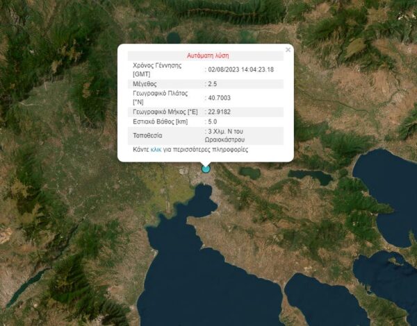 Σεισμός τώρα 3 χλμ. νότια του Ωραιοκάστρου – Αισθητός στη Θεσσαλονίκη