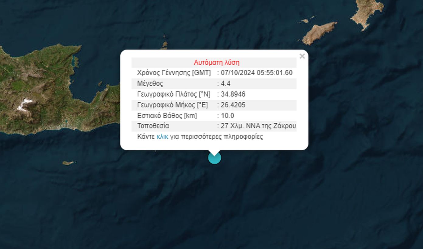 Το επίκεντρο του σεισμού εντοπίστηκε 27 χιλιόμετρα νότια-νοτιοανατολικά της Ζάκρου.