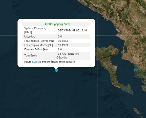 Σεισμός 3,6 βαθμών της κλίμακας Ρίχτερ σημειώθηκε σήμερα στις 11 το πρωί δυτικά της Κέρκυρας.