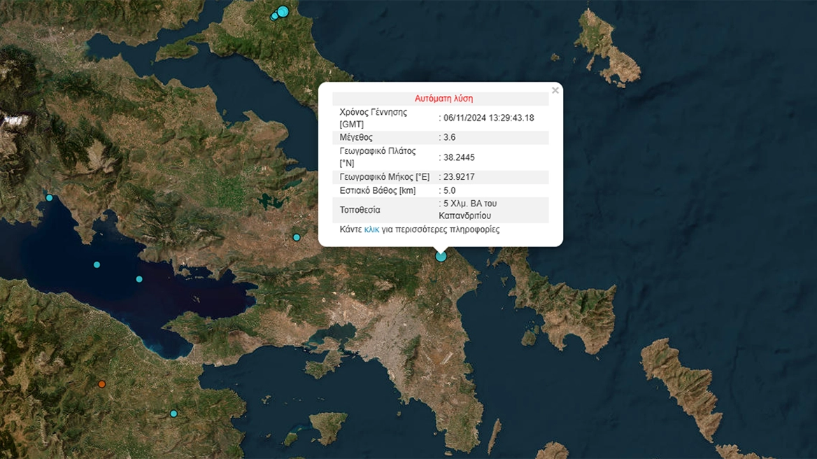 Σεισμός τώρα ταρακούνησε την Αττική… Σεισμική δόνηση καταγράφηκε το μεσημέρι της 6ης Νοεμβρίου στην περιοχή της Αττικής, προκαλώντας ανησυχία στους κατοίκους της πρωτεύουσας και των γύρω περιοχών. Σύμφωνα με την πρώτη εκτίμηση που παρείχε το Γεωδυναμικό Ινστιτούτο, η σεισμική δόνηση είχε μέγεθος 3,4 βαθμών της κλίμακας Ρίχτερ, ένταση που χαρακτηρίζεται σχετικά μέτρια για τα δεδομένα της περιοχής.