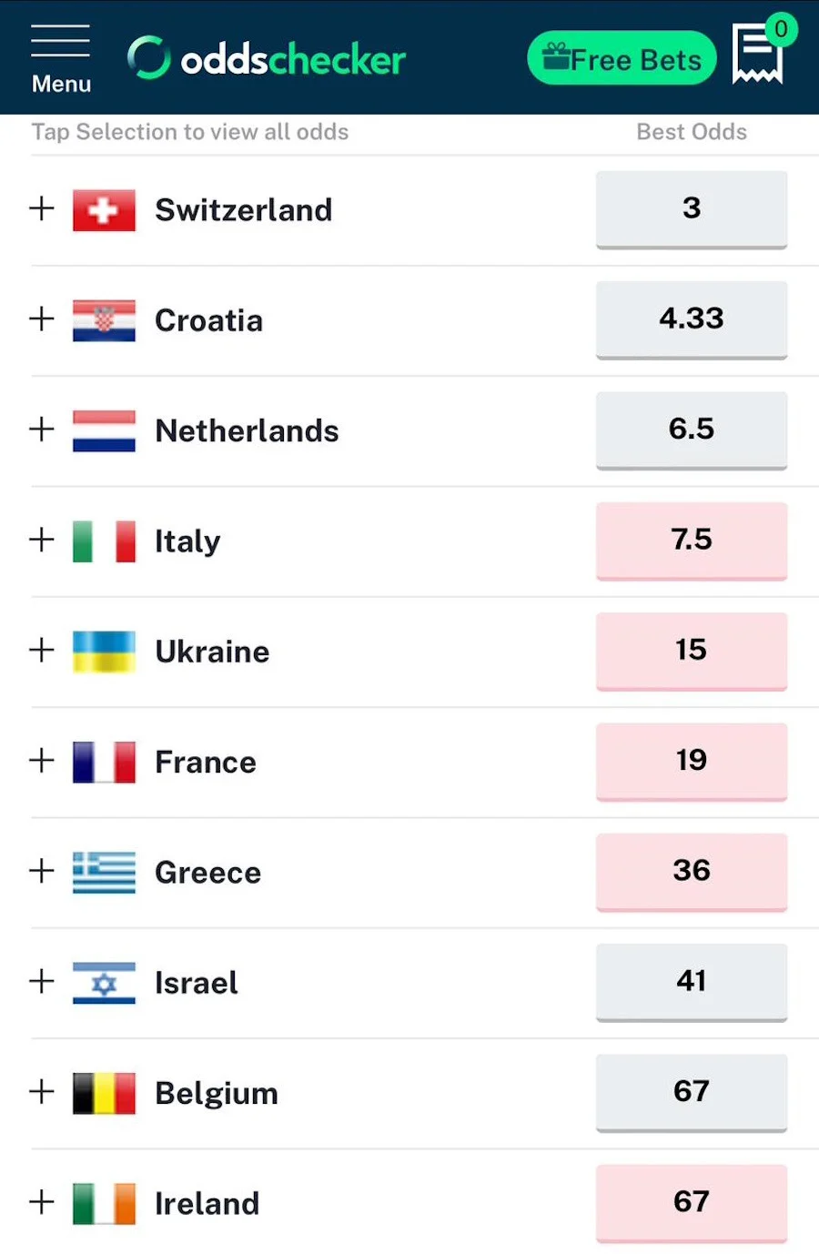 Από εκεί και πέρα, στην τέταρτη θέση των στοιχημάτων για νίκη στη Eurovision 2024 βρίσκεται η Ιταλία με απόδοση 7,5 και η πρώτη πεντάδα κλείνει με την Ουκρανία με απόδοση 15. Στην έκτη θέση είναι η Γαλλία με απόδοση 19 και στην έβδομη θέση πλασάρεται η Ελλάδα με απόδοση 36, κλείνοντας ουσιαστικά τις χώρες που διεκδικούν με αξιώσεις ακόμη και τη νίκη, εφόσον δεν φαίνεται να υπάρχει ξεκάθαρο φαβορί σε σύγκριση με τις δύο προηγούμενες χρονιές.