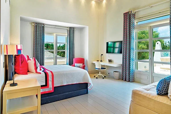 Τεράστιοι χώροι υποδοχής, αίθρια, σαλόνια με πανάκριβα υφάσματα, εκπληκτική minimal τραπεζαρία 24 ατόμων, γυμναστήρια, σάουνες, spa, 7 υπνοδωμάτια-σουίτες και 6 μπάνια δεσπόζουν στο κεντρικό κτίριο της βίλας. Υπάρχει όμως ακόμα ένας οικίσκος που λειτουργεί ως ξενώνας, ο οποίος αποτελείται από 5 υπνοδωμάτια και 4 δωμάτια προσωπικού. Υπάρχουν δηλαδή συνολικά 12 δωμάτια και 8 δωμάτια προσωπικού.