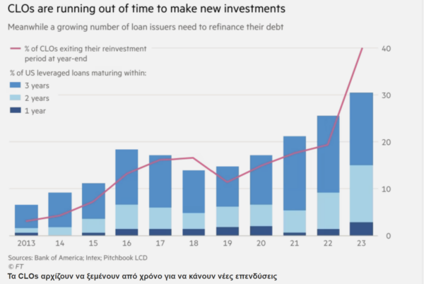 Ο στρατηγικός αναλυτής της Bank of America, Pratik Gupta, εκτιμά ότι μέχρι το τέλος του έτους περίπου το 40% των CLOs θα βγει από την περίοδο επανεπένδυσης, μειώνοντας τη ζήτηση για νέα δάνεια.