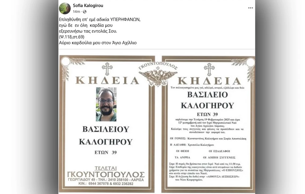 Η μητέρα του αδικοχαμένου 39χρονου, μέσα από μία νέα ανάρτηση της στα μέσα κοινωνικής δικτύωσης, γνωστοποίησε την ημέρα και την ώρα της κηδείας, εκφράζοντας τον αβάσταχτο πόνο της. Στην ανάρτησή της, μάλιστα, συμπεριέλαβε έναν στίχο από τους Ψαλμούς του Δαβίδ, ο οποίος αντανακλά τη θλίψη αλλά και τη δύναμη που αντλεί από την πίστη της: