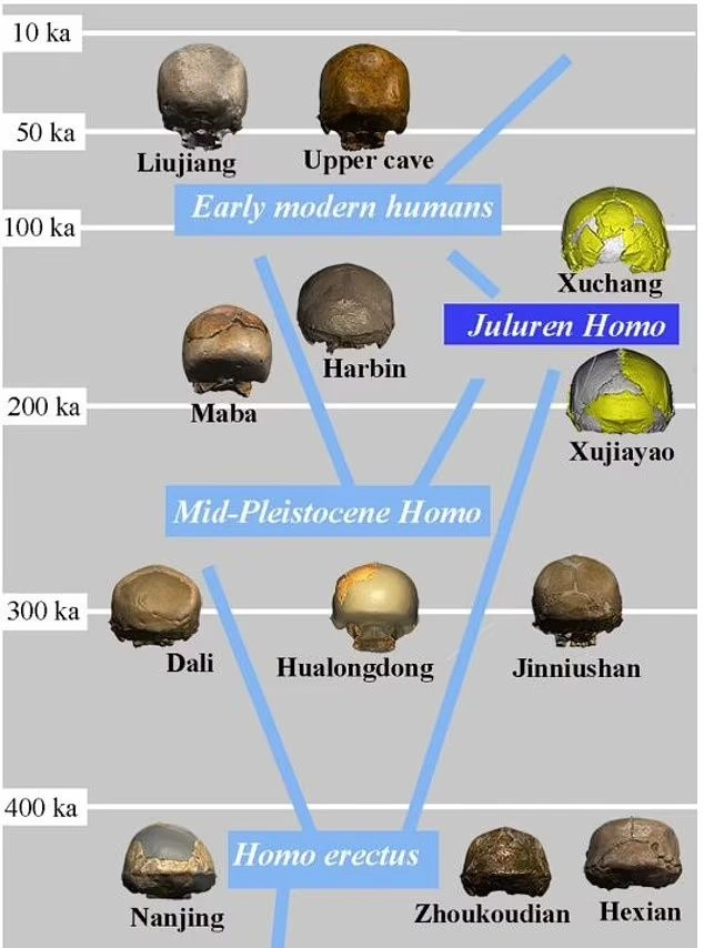Επιστήμονες ανακάλυψαν νέο είδος ανθρώπου με τεράστιο κρανίο… Μια σημαντική ανακάλυψη φέρνει στο φως ένα αρχαίο είδος ανθρώπου με πολύ μεγάλο κρανίο, που ζούσε παράλληλα με τον Homo Sapiens . Το είδος αυτό, γνωστό ως Juluren , ή «άνθρωποι με μεγάλο κεφάλι», πιστεύεται ότι κατοικούσε στην περιοχή της σημερινής Κίνας πριν από 300.000 έως 50.000 χρόνια.