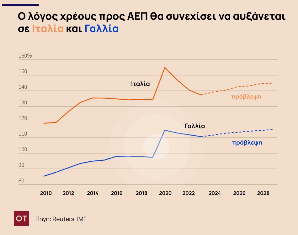 Το πρόβλημα είναι ότι τα επίπεδα χρέους προβλέπεται να συνεχίσουν να αυξάνονται, φτάνοντας το 145% του ΑΕΠ για την Ιταλία και το 115% για τη Γαλλία έως το 2029, σύμφωνα με το ΔΝΤ. Έτσι, οι δείκτες δανεισμού θα εξακολουθήσουν να παραμένουν υψηλοί ακόμη και μετά από κάποιες δημοσιονομικές περικοπές.