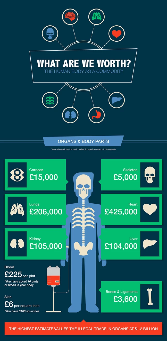 Όπως διαβάζουμε σε αυτό, το ανθρώπινο σώμα είναι αρκετά πολύτιμο: οι κερατοειδείς κοστίζουν περίπου 20.880 ευρώ (το ρεπορτάζ είναι σε Λίρες Αγγλίας), τα πνευμόνια 286.729 ευρώ, ο σκελετός περίπου 7000 ευρώ και η καρδιά 592.000 ευρώ.