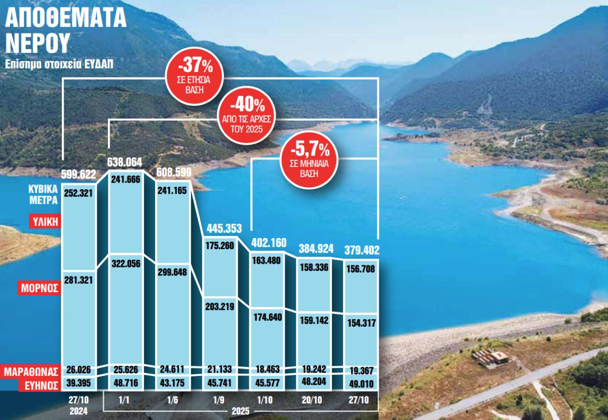Σύμφωνα με τα στοιχεία της ΕΥΔΑΠ, στις 27 Οκτωβρίου 2025, οι τέσσερις ταμιευτήρες (με την προσθήκη του Εύηνου) περιείχαν συνολικά λιγότερα από 380 εκατομμύρια κυβικά μέτρα νερού. Αυτό αντιστοιχεί μόλις στο περίπου 25% της συνολικής τους χωρητικότητας, δηλαδή σχεδόν τα τρία τέταρτα των ταμιευτήρων είναι άδεια.